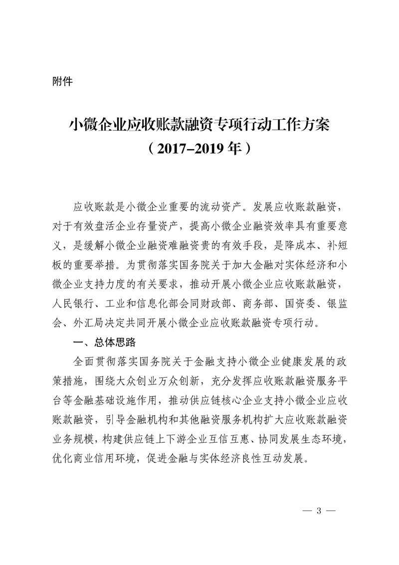 根据国务院统一部署,为进一步提高小微企业金融服务水平,近日,人民银行、工业和信息化部会同财政部、商务部、国资委、银监会、外汇局联合印发了《小微企业应收账款融资专项行动工作方案(2017-2019年)》(以下简称《方案》),立足实体经济,聚焦小微企业,全面实施小微企业应收账款融资专项行动。