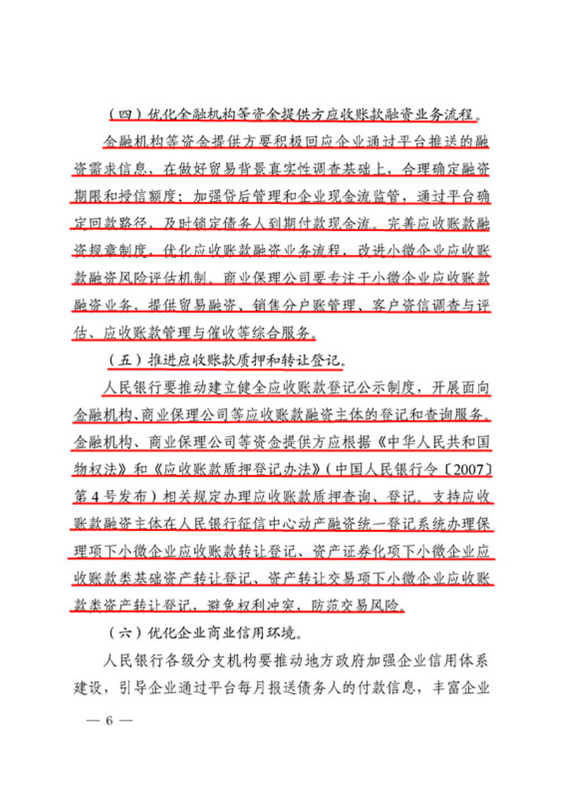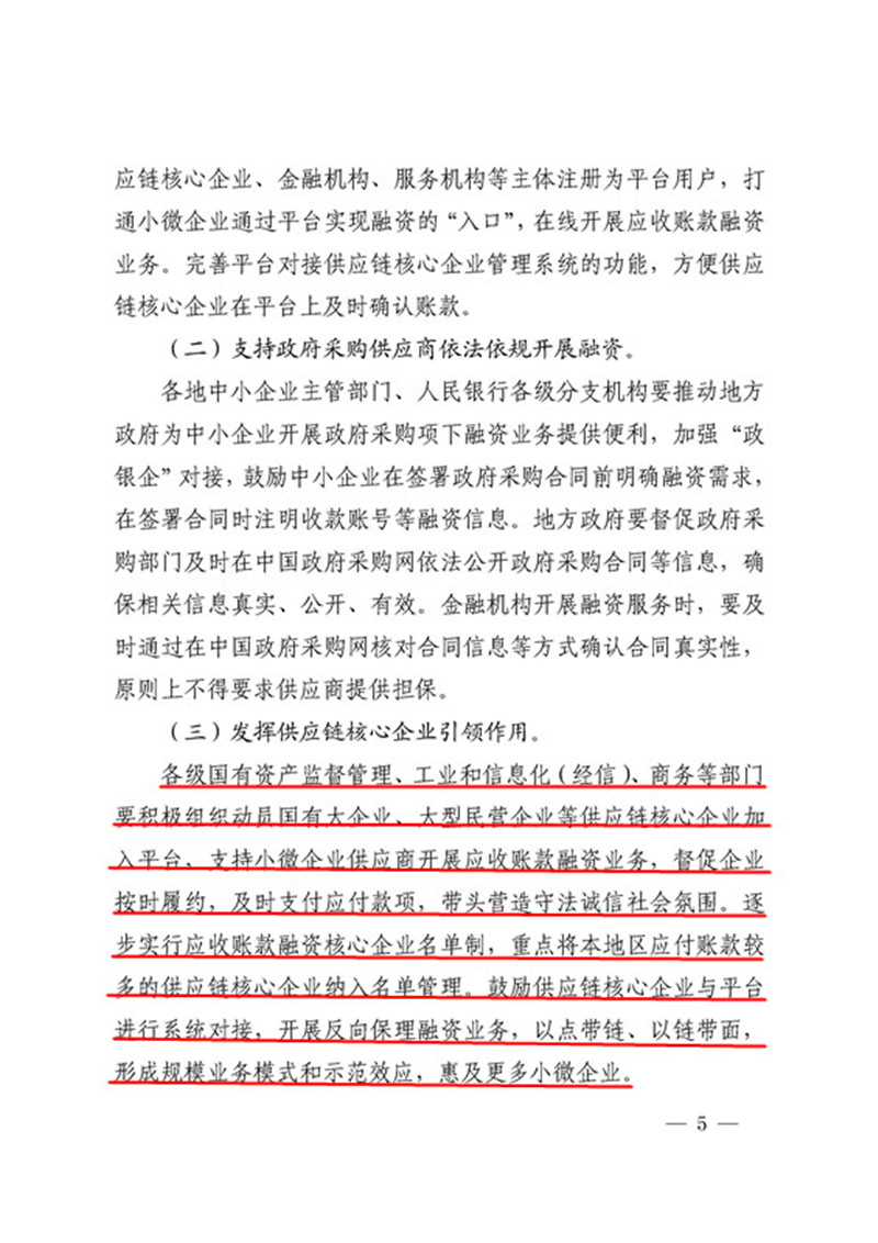 《方案》提出,要向小微企业普及应收账款融资知识,向应付账款较多企业、供应链核心企业、大型零售企业开展宣传培训,加强应收账款融资业务的推广;要推动地方政府为中小企业开展政府采购项下融资业务提供便利,支持政府采购供应商依法依规开展融资;要动员国有大企业、大型民营企业等供应链核心企业支持小微企业供应商开展在线应收账款融资业务,发挥供应链核心企业引领作用;要优化金融机构等资金提供方应收账款融资业务流程,提高企业融资便利度;要建立健全应收账款登记公示制度,保障各方权利。