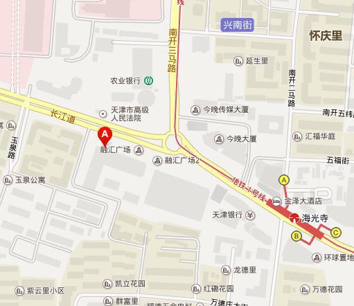 天津市南开区南京路与长江道交汇金融街(南开)中心B座B1层(今晚报对面),地铁1号线海光寺站B口出步行650米。