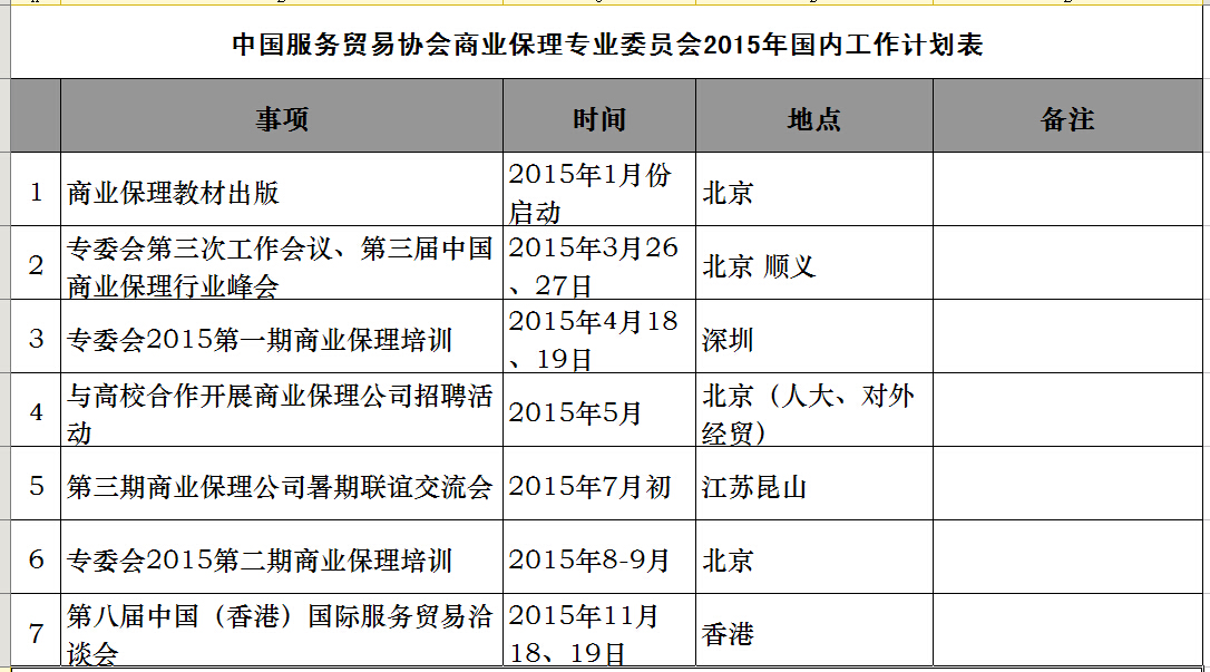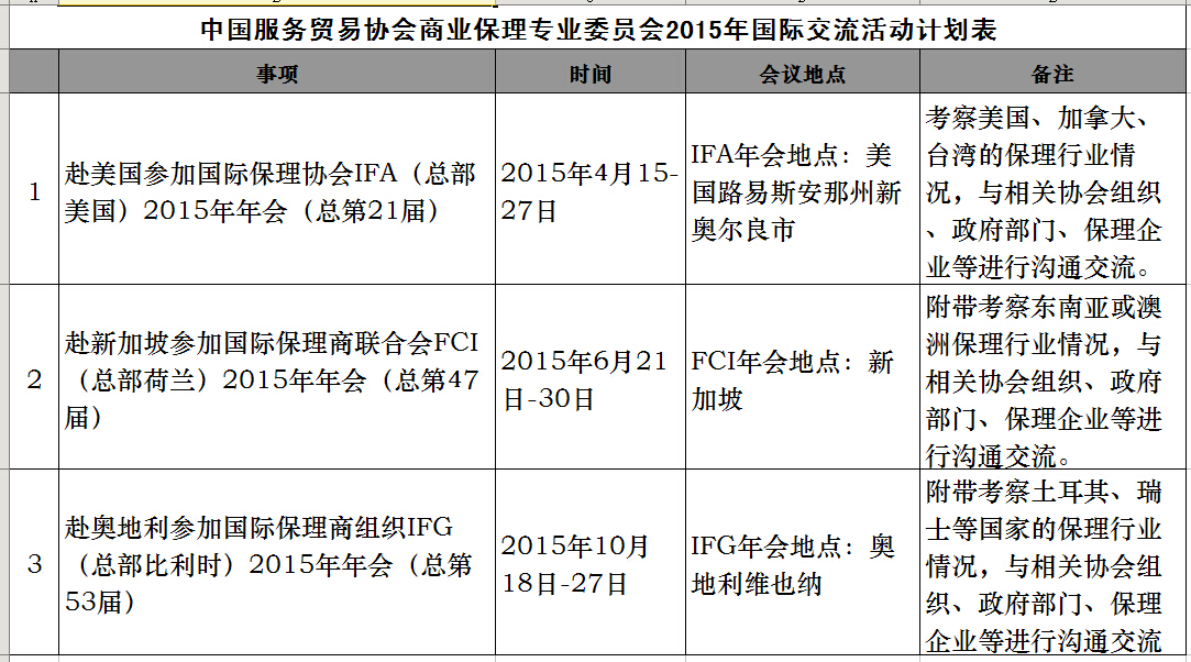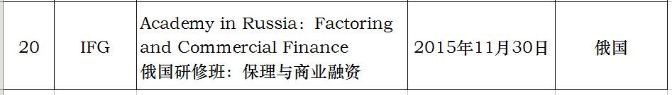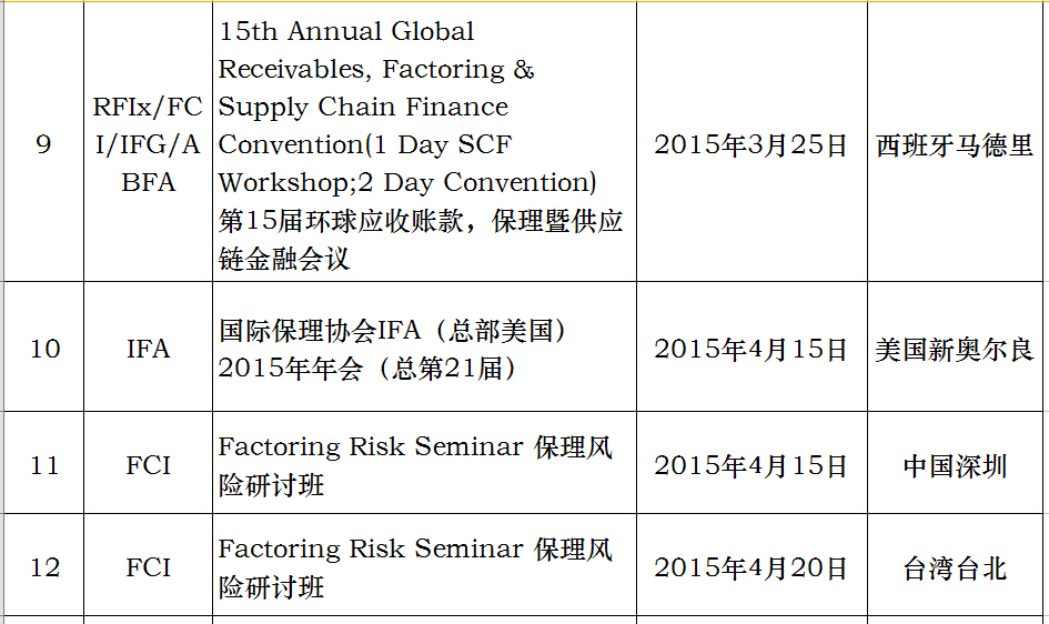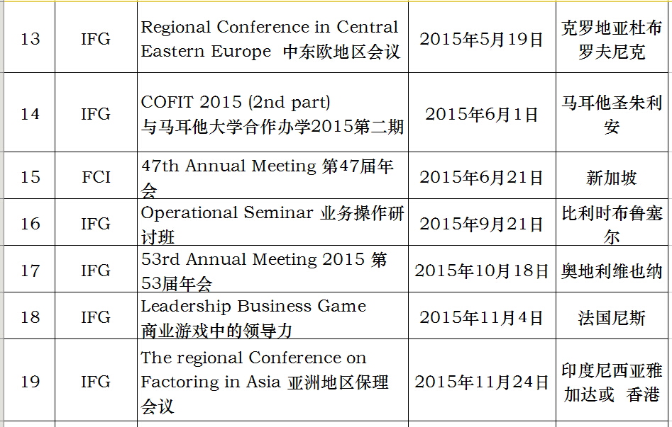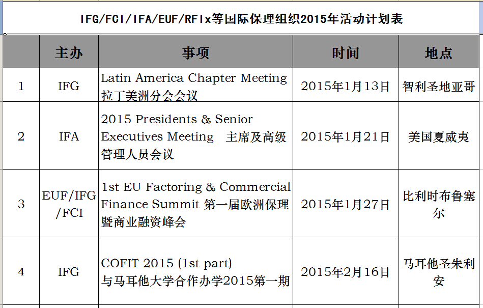 下表为国际保理组织2015年计划表,也希望感兴趣的同仁们来电咨询。