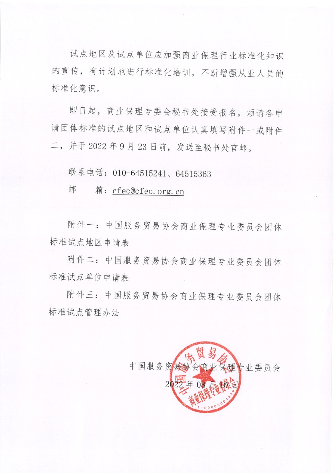 即日起,商业保理专委会秘书处接受报名,烦请各申请团体标准的试点地区和试点单位认真填写附件一或附件二,并于2022年9月23日前,发送至秘书处官邮。
