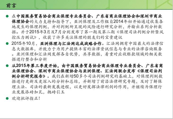 在中国服务贸易协会商业保理专业委员会、广东省商业保理协会和深圳市商业保理协会的大力支持和指导下,亚洲保理及工作组自2014年初开始通过收集各地发生的保理判例,并对判例所呈现的风险进行研究分析,并输出系列分析数据。并于2015年3月及7月分别发布了第一期及第二期《保理司法判例分析暨风控压力测试》,收获了许多关注保理的朋友们的宝贵建议。